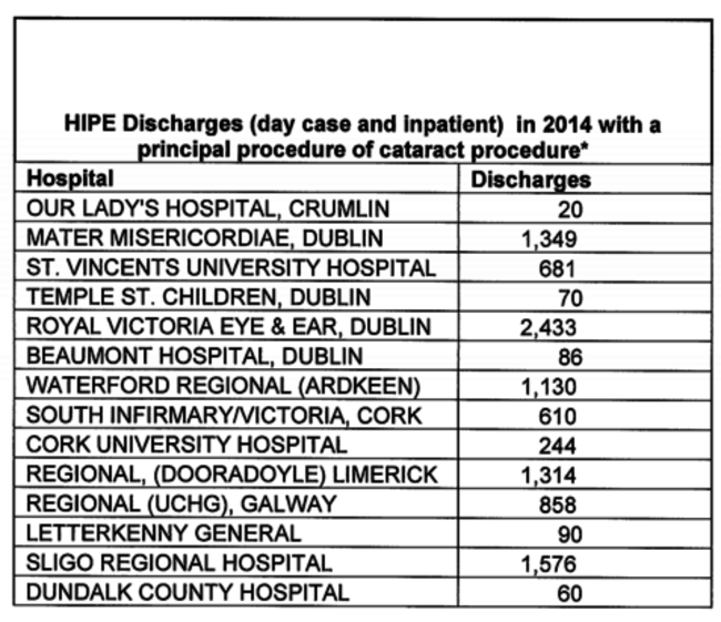 Naughten has called on the HSE to utilise spare capacity within hospitals to address the wait. In St Vincent’s Hospital in Dublin, for examples, 681 cataract procedures were carried out last year and the hospital has 151 people on its opthalmology list with only six patients waiting longer than six months.