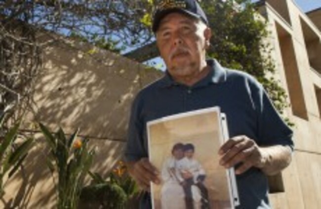 Frank Zamora, 67, holds an old photo of his son Dominic Zamora, then 8, sitting on the lap of his abuser, priest Michael Stephen Baker. AP Photo/Damian Dovargane