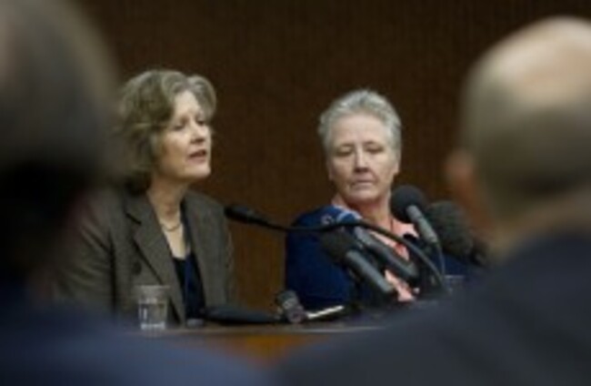 Sheila Hollins, left, speaks at the conference with abuse victim Marie Collins Andrew Medichini/AP/Press Association Images