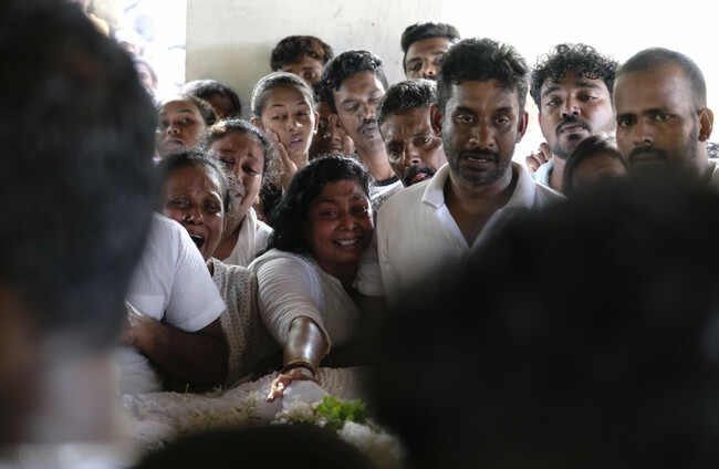 Relatives of a victim of the explosions mourn during a funeral in Colombo. Xinhua News Agency/PA Images