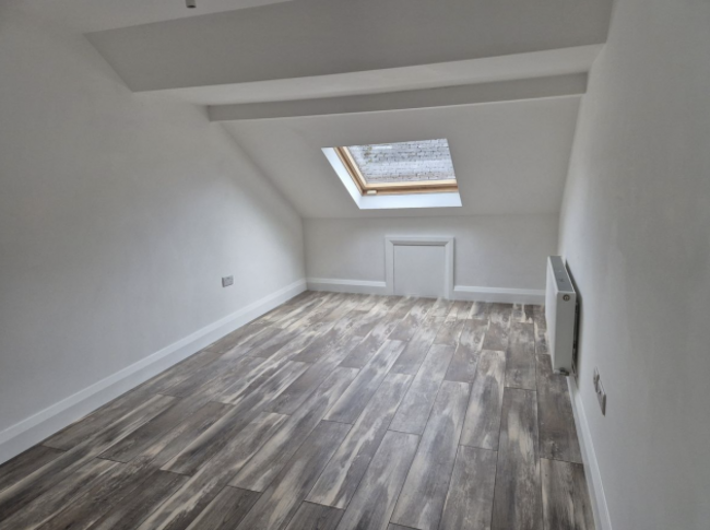 The first floor has a well-proportioned bedroom with warm laminated oak flooring, offering a cosy retreat at the end of the day. A separate shower room featuring white marble tiling, alongside a bathroom with wash-hand basin, provides a comfortable and contemporary setup.