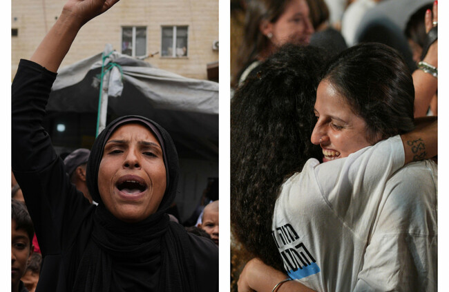 A Palestinian woman celebrates the news outside Al-Aqsa Hospital in Deir al-Balah, central Gaza Strip [left], and relatives and supporters of Israeli hostages gathered at a plaza known as the hostages square in Tel Aviv, Israel [right].