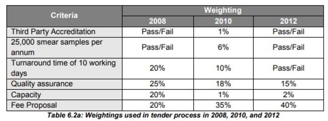 His most recent report had shown the emphasis on quality assurance dropped from 25% in the 2008 tender process for laboratories to 15% in the 2012 tender.