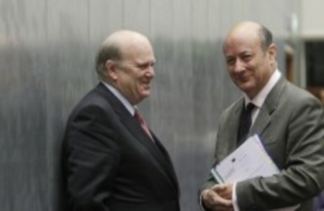 Michael Noonan and Polish Finance Minister Jacek Rostowski at yesterday's ESM meeting in Luxenbourg Virginia Mayo/AP/Press Association Images