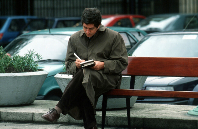 Bird writes up his notes while sitting on a bench outside the Dáil in 1991. RollingNews.ie