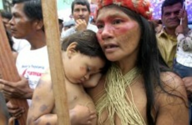 A indigenous Huaorani woman holds her son during a protest outside against Chevron-Texaco in 2003.