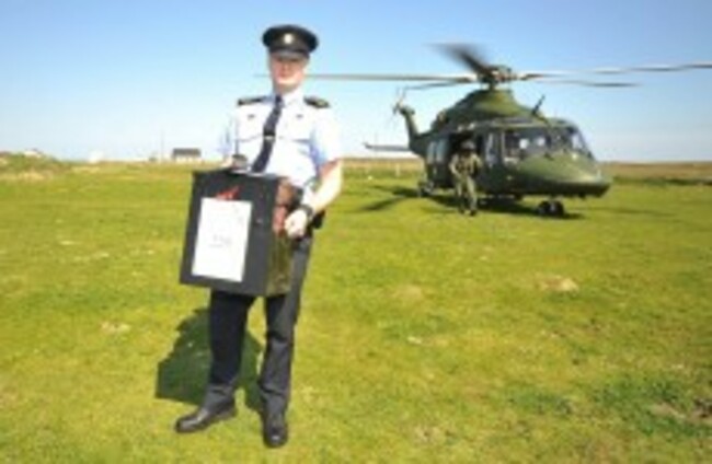 Garda Eugene Organ carrying a ballot box to the polling station on Tory island for the fiscal compact referendum earlier this year. Artur Widak/PA Wire/Press Association Images