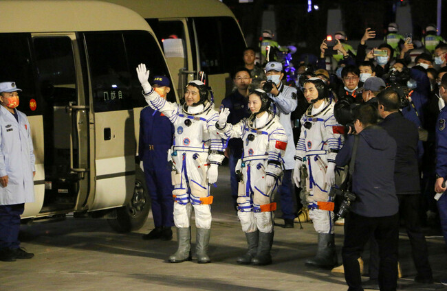 From left, Chinese astronauts Zhai Zhigang, Wang Yaping, and Ye Guangfu, wave before leaving for the Shenzhou-13 crewed space mission at the Jiuquan Satellite Launch Centre in northwest China Chinatopix via PA Images