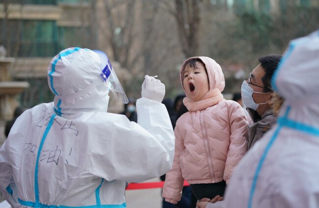 A medical worker collects a swab sample from a girl at a community in Qiaoxi District of Shijiazhuang Xinhua News Agency/PA Images