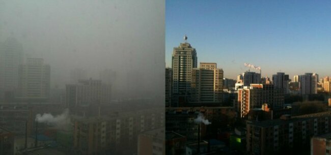 Pollution in Bejing earlier this year. Two days separate the two images, both taken in the same spot. (Image Credit: BananasUnited/Imgur)