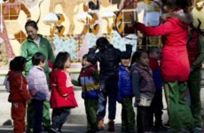 Kindergarten teachers play with children during an outdoor activity at the Ritan Park in Beijing. Andy Wong/AP