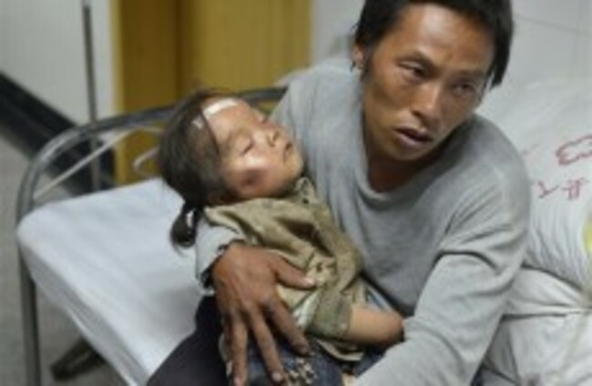 A man holds an injured child receiving medical treatment at a hospital following an earthquake in Ludian county in southwest China's Yunnan province AP