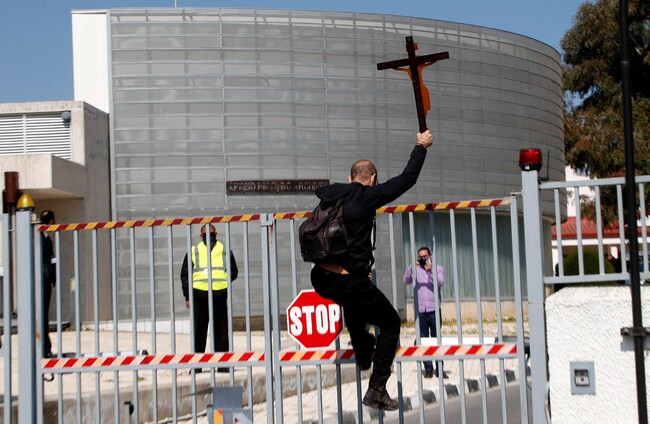 A protestor holding a cross climbs a gate outside Cyprus’s national broadcasting building Petros Karadjias