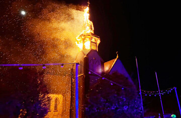 Units of Clare County Fire and Rescue Service from Ennis station were alerted and mobilised to the incident. As they approached the village, they could see a fire in distance. On arrival at the scene, they found the timber spire atop the church’s bell tower ‘well alight.’