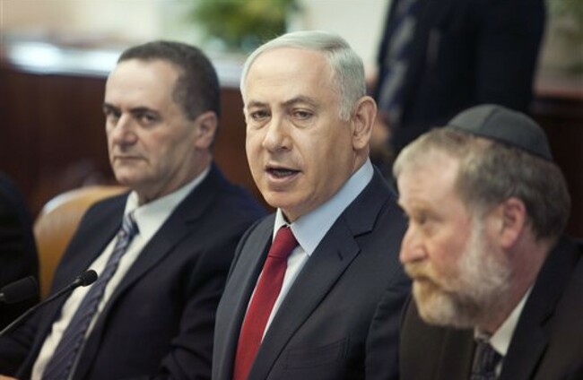 Israeli Prime Minister Benjamin Netanyahu, centre, attends a weekly cabinet meeting in Jerusalem yesterday. AP