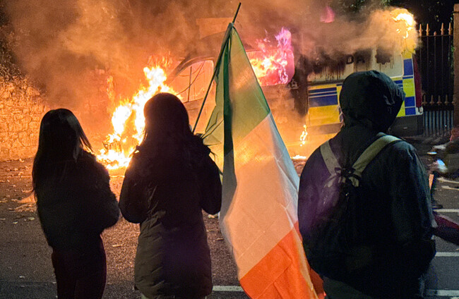 A Garda van burns outside the Citywest Hotel in west Dublin, after being set fire during a protest linked to the alleged sexual assault of a young girl in the area. Sasko Lazarov