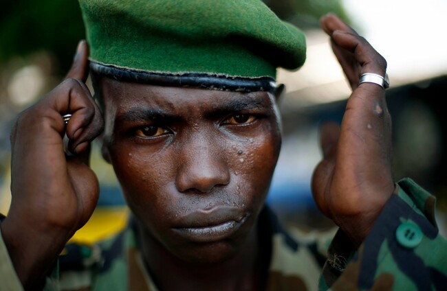 A Seleka Presidential Guardsman adjusts his beret at the downtown market in Bangui, Central African Republic. AP/Press Association Images