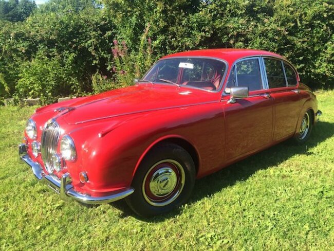 The Jaguar MK II is a stylish luxury saloon, one of the cars of its kind ever made. This particular example is finished in an eye-catching Carmen Red and sits atop stunning large chrome rims.  Tweed blazer is mandatory when driving.