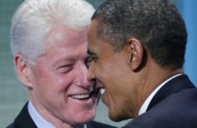 Former US President Bill Clinton and President Barack Obama embrace at the Clinton Global Initiative, Wednesday, Sept. 21, 2011, in New York Mark Lennihan/AP/Press Association Images
