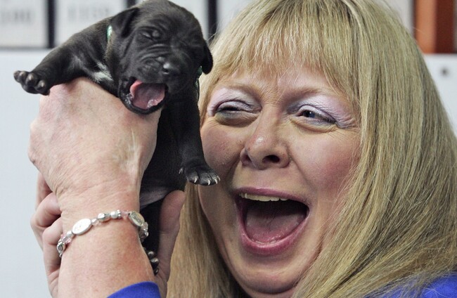 Bernann McKinney from the US holds one of five pitbulls cloned from her deceased pet 'Booger'. (File 2008) Ahn Young-joon/AP Images