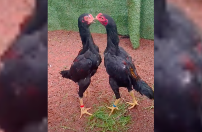 Two young chickens prepare to fight in a purpose-built cockpit. Facebook