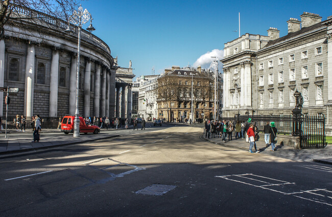 Hugging the corner where Westmoreland Street meets Dame Street, the building boasts pillared columns, a triplet of statues and curved walls of Portland stone.