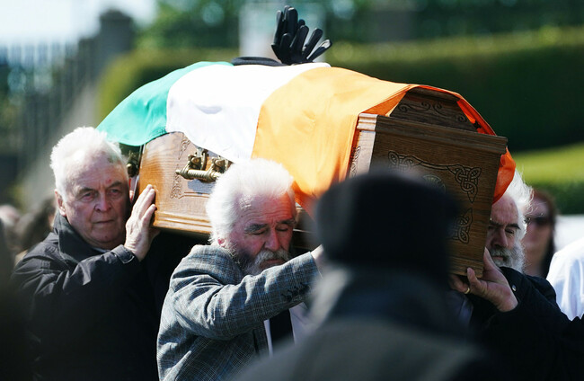 Several hundred people walked in the funeral procession while others watched as the coffin, bearing an Irish tricolour flag, a beret and a pair of black gloves, was carried.