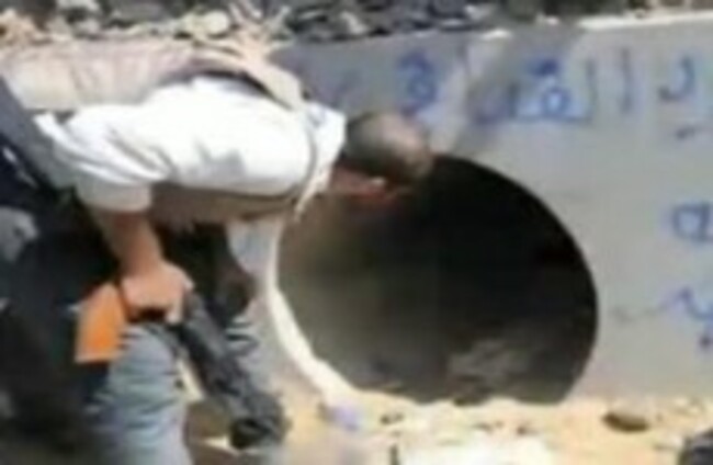 The hole where Gaddafi was reportedly captured by NTC forces in Sirte today. Libyan TV