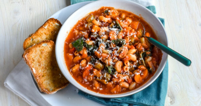 1. Add everything except the beans, pasta and kale into a large pot and allow to come to the boil. Reduce to a gentle simmer, clamp on the lid and give the soup two hours to cook through. [If you have a slow cooker, simply place the above ingredients into the pot, clamp on the lid and cook on low for four hours.]