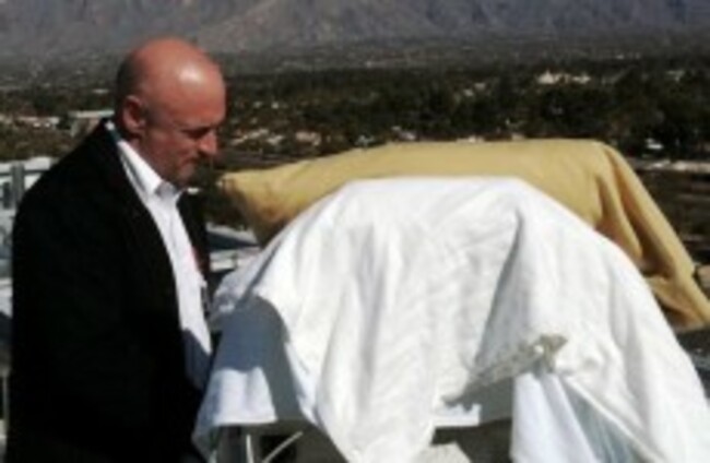 Mark Kelly, stands with his wife Gabrielle Giffords as she looks from her bed at the Santa Catalina Mountains while on an outdoor deck at University Medical Center in Tucson, Arizona in January. AP Photo/Office of U.S. Rep. Gabrielle Giffords