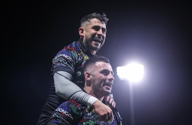 Andrew Smith celebrates scoring Connacht's bonus-point try with Tiernan O'Halloran. James Crombie/INPHO