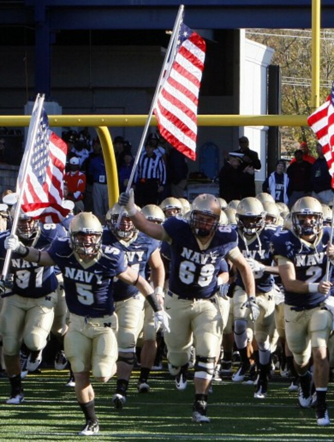Members of the Navy team heading onto the field before a game last November. Their college football season opener is to take place in Dublin - but potential legal proceedings could put that under threat. Ap Photo/Ann Heisenfelt/File)