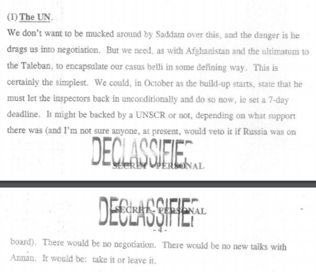 In the six-page note, marked Secret Personal, Blair said they needed an ultimatum to be put in front of Hussein in order to justify going to war.