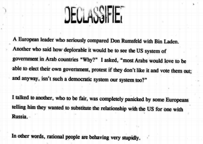 In a note to Bush on 26 March that year, Blair described the time as a “moment when you can define international politics for the next generation: the true post-cold war world order.”