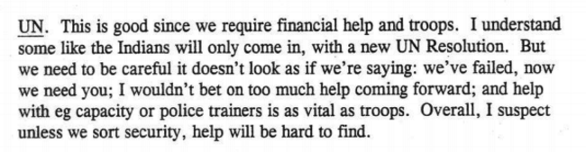 We can’t afford funding to be an issue here. I’ve just authorised an extra $78 million from our MOD for the Iraqi forces in the south. Can I be sure it is essential? No. But I’ll take the risk rather than find out six months later it was.