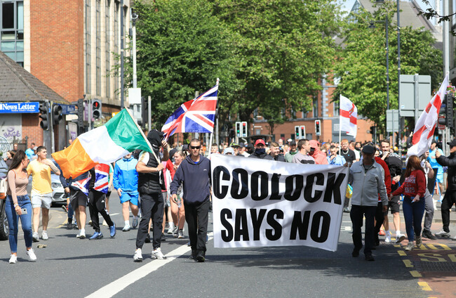 Coolock Says No banner greeted with anger at anti-migrant protest after Belfast loyalist march
