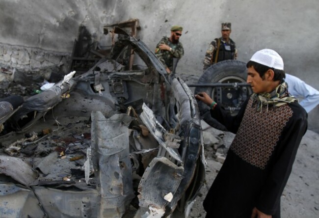 An Afghan man examines the remains of a car after three suicide bombers were killed before they reached Jalalabad airport, which security forces say was their target. (Rahmat Gul/AP/Press Association Images)