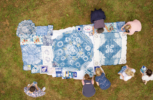 Volunteers have hand-dyed, embroidered, and appliquéd the tablecloth, spending hours at sewing machines and workshops. Titled ‘Gather Round’, the tablecloth has been the focus of numerous workshops held across the past month which has seen people up-cycling heirloom fabrics, natural indigo dyeing techniques, embroidery and raw edge appliqué.