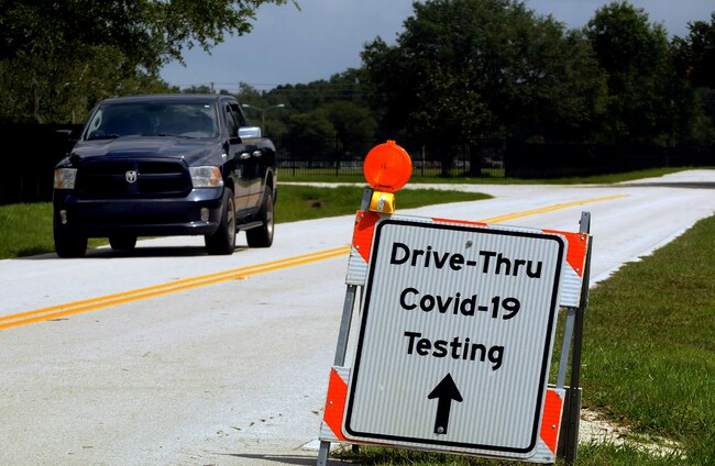 A sign directs people to a drive through COVID-19 testing site operated by the Florida Department of Health. SIPA USA/PA Images