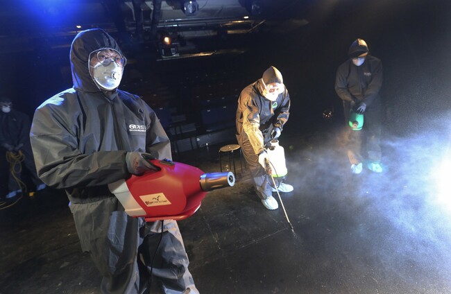 File photo. Workers in Korea disinfect a local theatre. Ahn Young-joon