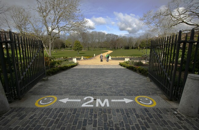 Painted social distancing signs on the entrance to Merrion Square in Dublin Sam Boal via RollingNews.ie