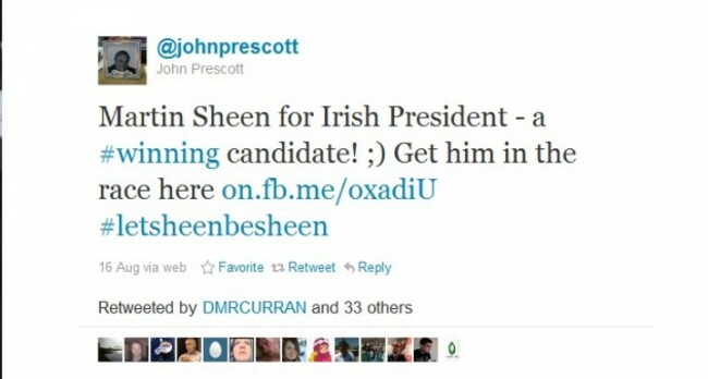 The most bizarre, television-inspired campaign yet has to be @Sheen4Aras, which has called on actor Martin Sheen to throw his hat in the ring. The West Wing star actually is an Irish citizen (as his mother, Mary Ann Phelan, was born in Tipperary). That means he hits at least some of the criteria – he is over 35 years of age and is a citizen of the country.