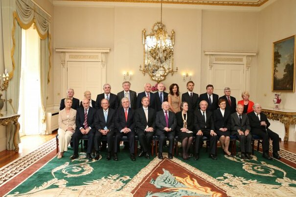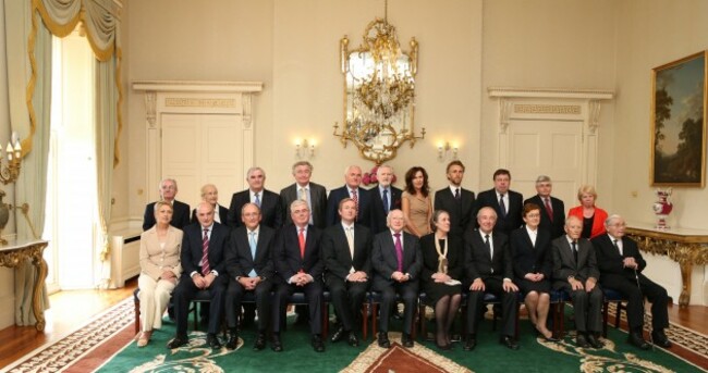 Council of State members from the back row: Professor Gearoid O'Tuathaigh, The Hon Mrs Justice Catherine McGuinness, The Hon Mr Justice John Murray, The Hon Mr Justice Ronan Keane, former Taoiseach Bertie Ahern, Mr Michael Farrell, Prof Deirdre Heehan, Mr Ruari Mc Kiernan, Former Taoiseah Brian Cowen, Professor Gerard Quinn and Ms Sally Mulready. Front row left to right: Former President Mary McAleese, Cathaoirleach of the Seanad Paddy Burke, Ceann Comhairle of the Dáil Seán Barrett, Tanaiste Eamon Gilmore, Taoiseach Enda Kenny, President Michael D Higgins, Ms Susan Denham Chief Justice, The Hon Mr Justice Nicholas Kearns, Ms Marie whelan Attorney General and former Taoiseach Liam Cosgrave. Pic Sasko Lazarov/Photocall Ireland