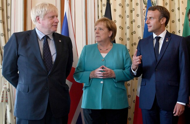 British Prime Minister Boris Johnson with German Chancellor Angela Merkel and French President Emmanuel Macron at the EU meeting during the 2019 G7 summit in Biarritz, France. Andrew Parsons/PA