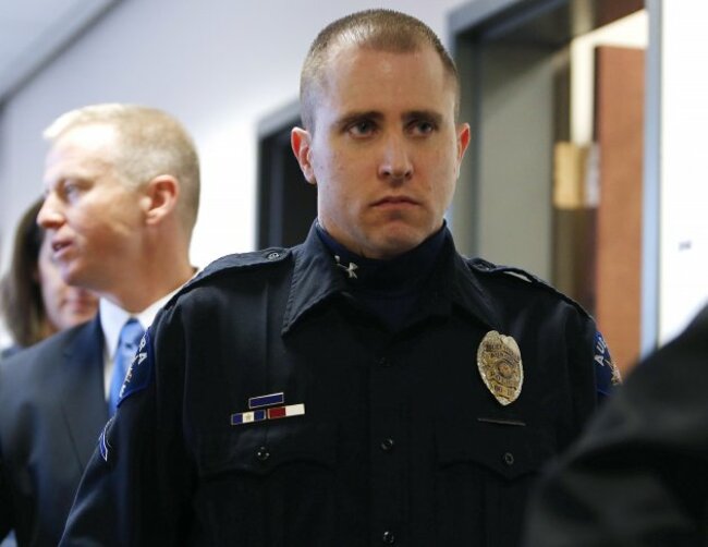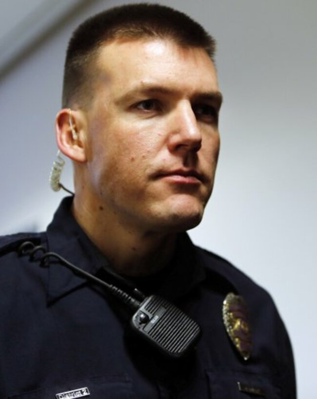 Officer Justin Grizzle (above), a former paramedic, said he almost slipped over in a “huge amount of blood” as he entered the back entrance to the Century 16 movie theatre.