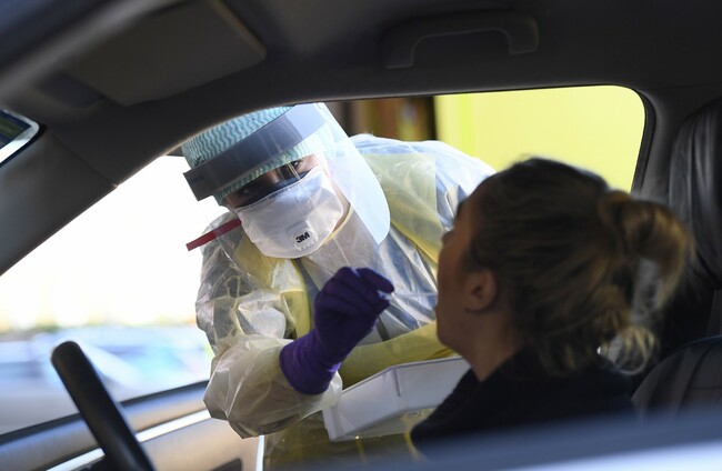 A nurse demonstrates drive-through coronavirus testing procedures. Michael Cooper/PA Wire