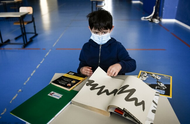 A child sits in a makeshift classroom inside a gym, as part of a pilot test to see how schools can reopen after Covid-19 in the region of Piedmont, Italy. SIPA USA/PA Images