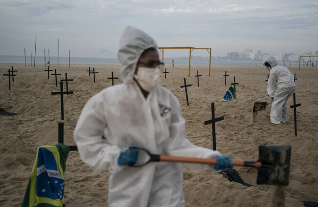 Activists from the NGO Rio de Paz digging graves on Copacabana beach in a protest against the Brazilian government's handling of the pandemic. Ian Cheibub/DPA/PA Images