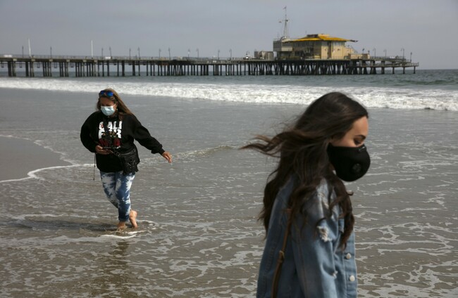 Malia Pena (foreground) and her mother, Lisa Torriente, wear masks as they visit the beach in Santa Monica, California, yesterday. Jae C Hong/AP/Press Association Images