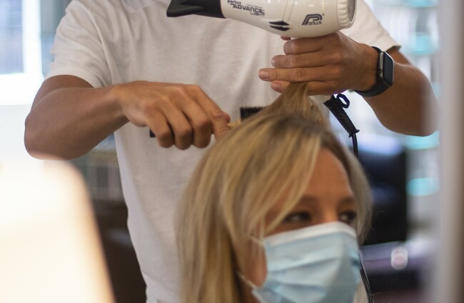 Senior Style Director Nick Peters wears PPE as he cuts a staff member's hair at Daniel Galvin hairdressers in Marylebone, England, in preparation for reopening. Victoria Jones/PA Wire/PA Images